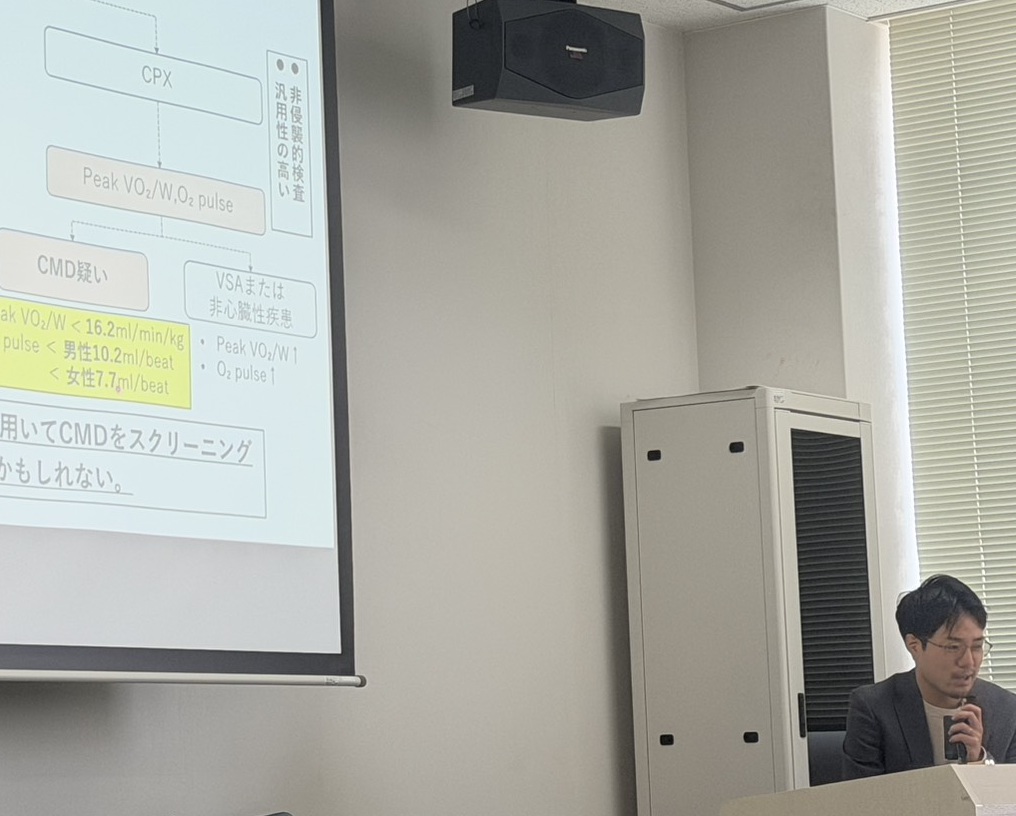 永井くんはこれまで,「冠微小循環障害における心肺運動負荷試験の有用性の検証」をテーマに研究を進めてきました.日々の臨床と並行しながら取り組んできた2年間の成果がまとめられた発表となりました.